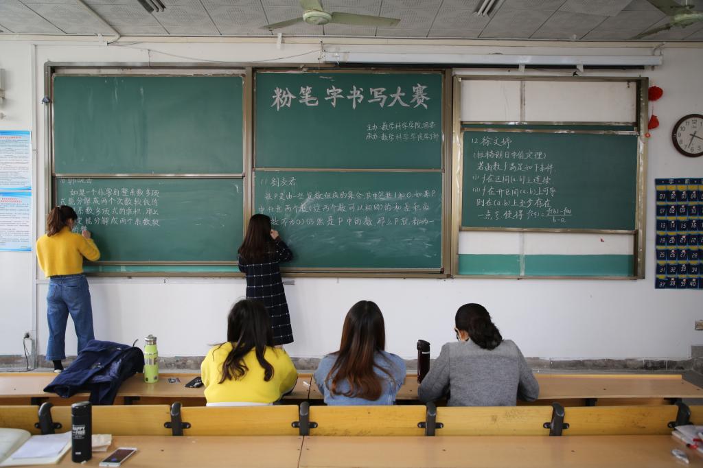 首先,主持人宣布比赛流程及规则,比赛计分采取小组赛淘汰制,三人一组进行分组比赛,评委根据选手们的作品进行打分点评。比赛的书写内容取自数学本科学科教材内定义及定理,考察参赛选手的数学专业知识与粉笔字书写技能,比赛开始后,选手们屏气凝神,一丝不苟地书写,显示出沉稳、冷静、严谨的师者风范。随着一轮轮小组赛的结束,此次粉笔字书写大赛也落下帷幕,最终任寒梅,卫笑天两位同学获得了本次比赛的一等奖。