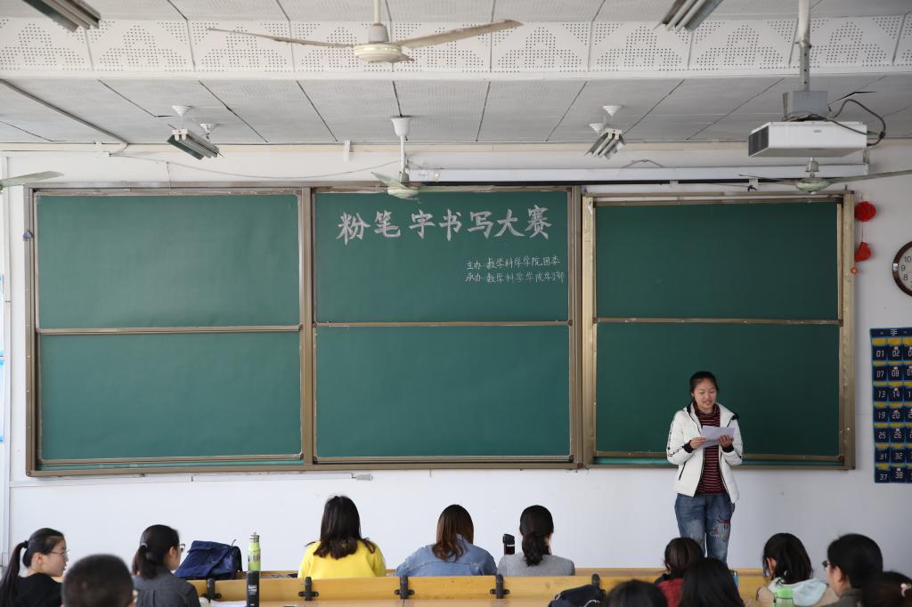 3月17日下午,由金沙集团wwW3354CC团委主办的“展书写技能,育教师风采”粉笔字书写大赛在数学楼顺利举行,该比赛响应了学院强化师范生“三字一话”素质训练的号召,是学院上下齐心协力推进师范生认证工作的重要一环。2017、2018级两个年级共35位同学参加了本次比赛。